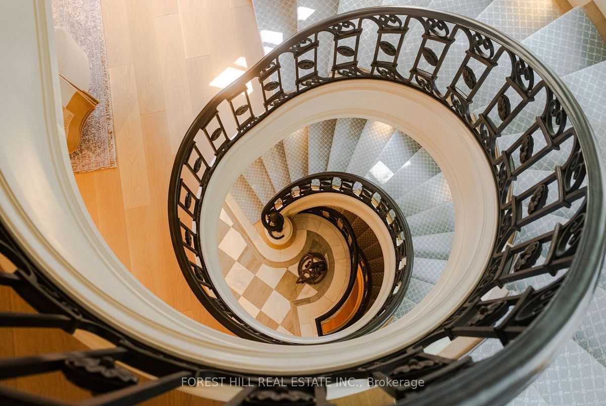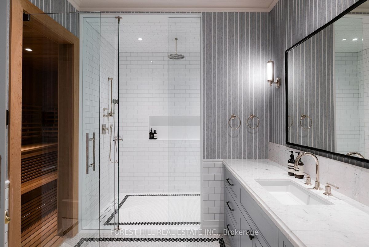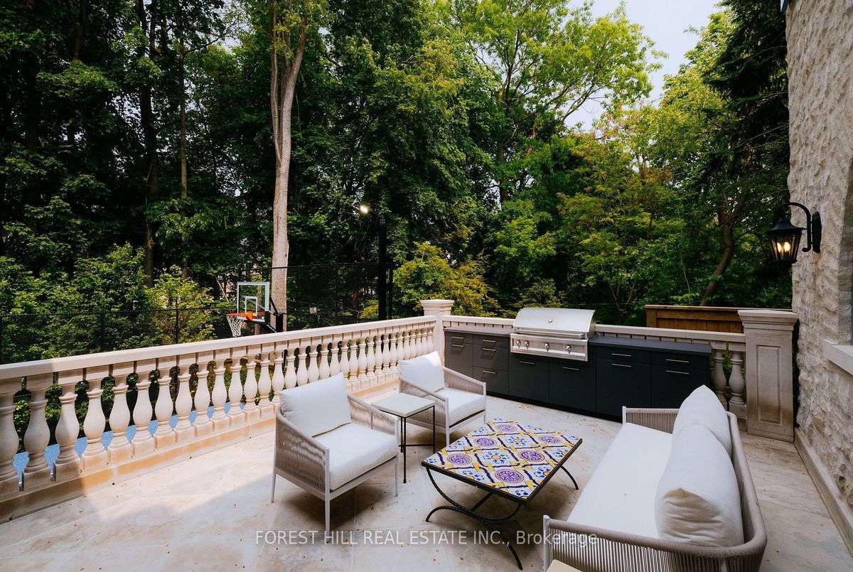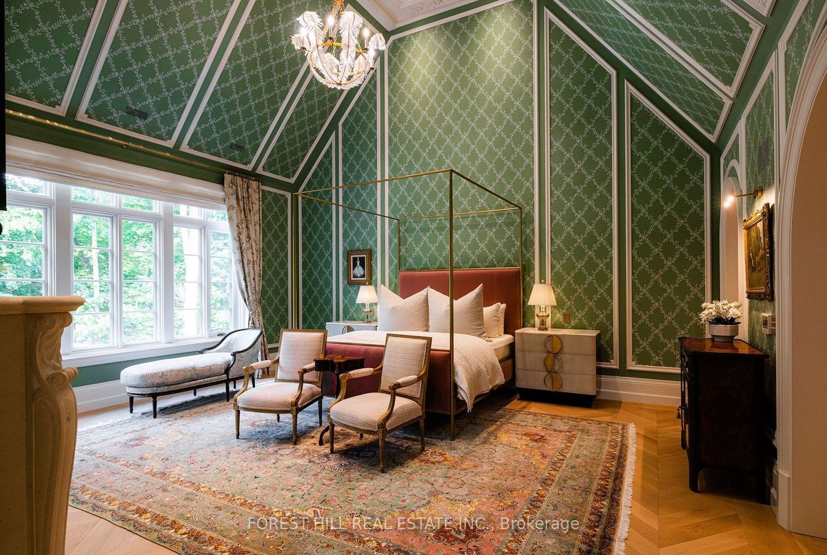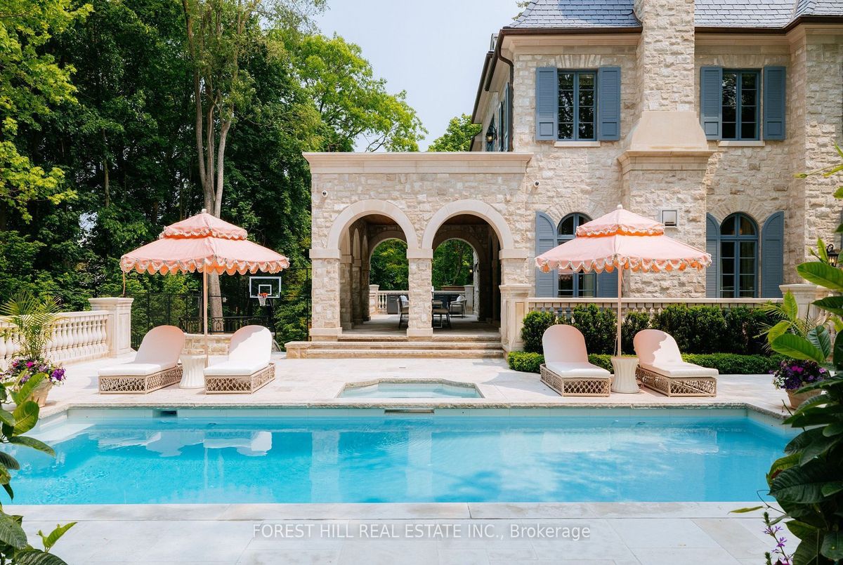 Welcome to 221 Forest Hill Road, an architectural triumph with nearly 13,000 sq ft of living space on a private 17,000 sq ft lot, nestled along the Beltline Trail in the heart of one of Toronto's most exclusive enclaves. This estate represents the pinnacle of bespoke luxury, meticulously brought to life by the city's finest: JTF Homes, Lorne Rose Architect, and Dvira Interiors. Clad in hand-selected limestone and inspired by the romance of the French countryside, the residence evokes the timeless elegance of a Provencal chateau. Arched windows with weathered-blue shutters, a stately turret, and a gracefully symmetrical facade create a striking first impression. A dramatic arcaded loggia opens onto manicured grounds and landscaping imagined by Fitzgerald and Roderick, featuring a lap pool, sports court, and lavish gardens that offer privacy and tranquility. The interiors are nothing short of breathtaking curated blend of old-world grandeur and modern refinement. The main level features soaring ceilings and a dramatic spiral staircase. Chevron-patterned white oak floors, arched passages, imported wallpaper, and tailored lighting reflect impeccable attention to detail. The formal dining room (seating 20) flows effortlessly into a statement kitchen adorned with hand-painted Portuguese tiles and custom cabinetry by Emanuele Furniture Design. The sunlit family room is anchored by a hand-carved fireplace and opens onto the gardens through elegant French doors. The crown jewel is the primary suite, a true sanctuary with vaulted ceilings, whimsical wallpaper, arched detailing, and a fireside lounge that creates a retreat-like atmosphere. The piece de resistance: a couture-inspired, two-storey dressing room with a spiral staircase and chandelier, paired with a spa-like ensuite clad in expansive stone and Shirley Wagner fixtures. The lower level features a sprawling rec room, games lounge, prep kitchen, gym, cedar sauna, and a home theatre for the ultimate cinematic escape.