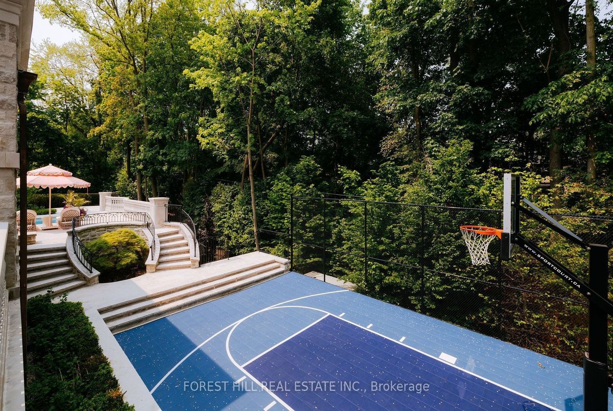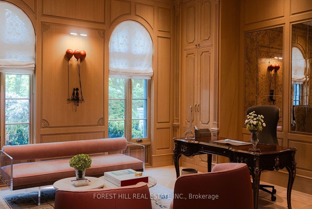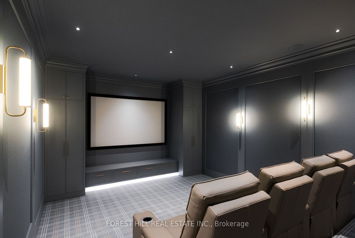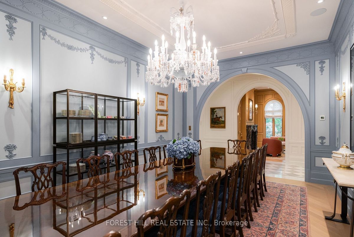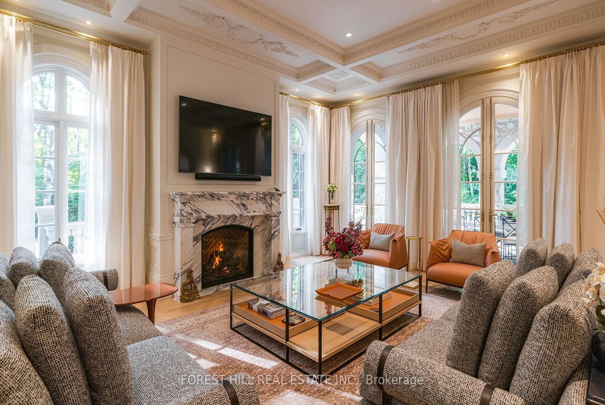 Welcome to 221 Forest Hill Road, an architectural triumph with nearly 13,000 sq ft of living space on a private 17,000 sq ft lot, nestled along the Beltline Trail in the heart of one of Toronto's most exclusive enclaves. This estate represents the pinnacle of bespoke luxury, meticulously brought to life by the city's finest: JTF Homes, Lorne Rose Architect, and Dvira Interiors. Clad in hand-selected limestone and inspired by the romance of the French countryside, the residence evokes the timeless elegance of a Provencal chateau. Arched windows with weathered-blue shutters, a stately turret, and a gracefully symmetrical facade create a striking first impression. A dramatic arcaded loggia opens onto manicured grounds and landscaping imagined by Fitzgerald and Roderick, featuring a lap pool, sports court, and lavish gardens that offer privacy and tranquility. The interiors are nothing short of breathtaking curated blend of old-world grandeur and modern refinement. The main level features soaring ceilings and a dramatic spiral staircase. Chevron-patterned white oak floors, arched passages, imported wallpaper, and tailored lighting reflect impeccable attention to detail. The formal dining room (seating 20) flows effortlessly into a statement kitchen adorned with hand-painted Portuguese tiles and custom cabinetry by Emanuele Furniture Design. The sunlit family room is anchored by a hand-carved fireplace and opens onto the gardens through elegant French doors. The crown jewel is the primary suite, a true sanctuary with vaulted ceilings, whimsical wallpaper, arched detailing, and a fireside lounge that creates a retreat-like atmosphere. The piece de resistance: a couture-inspired, two-storey dressing room with a spiral staircase and chandelier, paired with a spa-like ensuite clad in expansive stone and Shirley Wagner fixtures. The lower level features a sprawling rec room, games lounge, prep kitchen, gym, cedar sauna, and a home theatre for the ultimate cinematic escape.