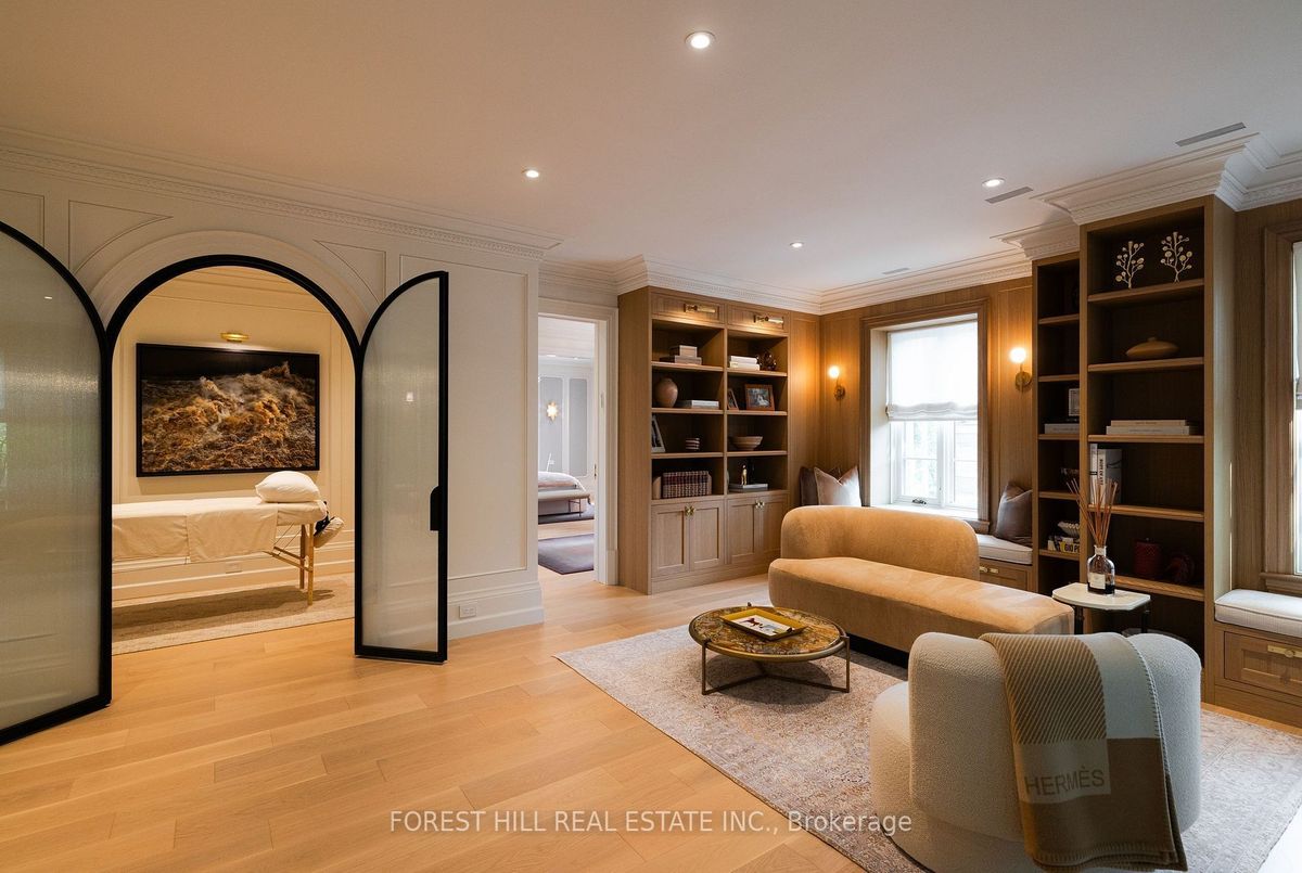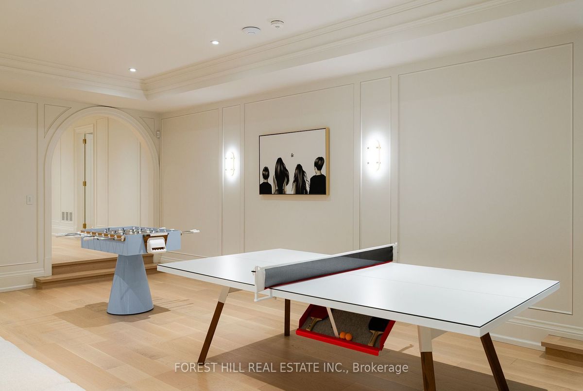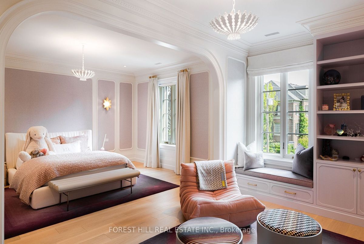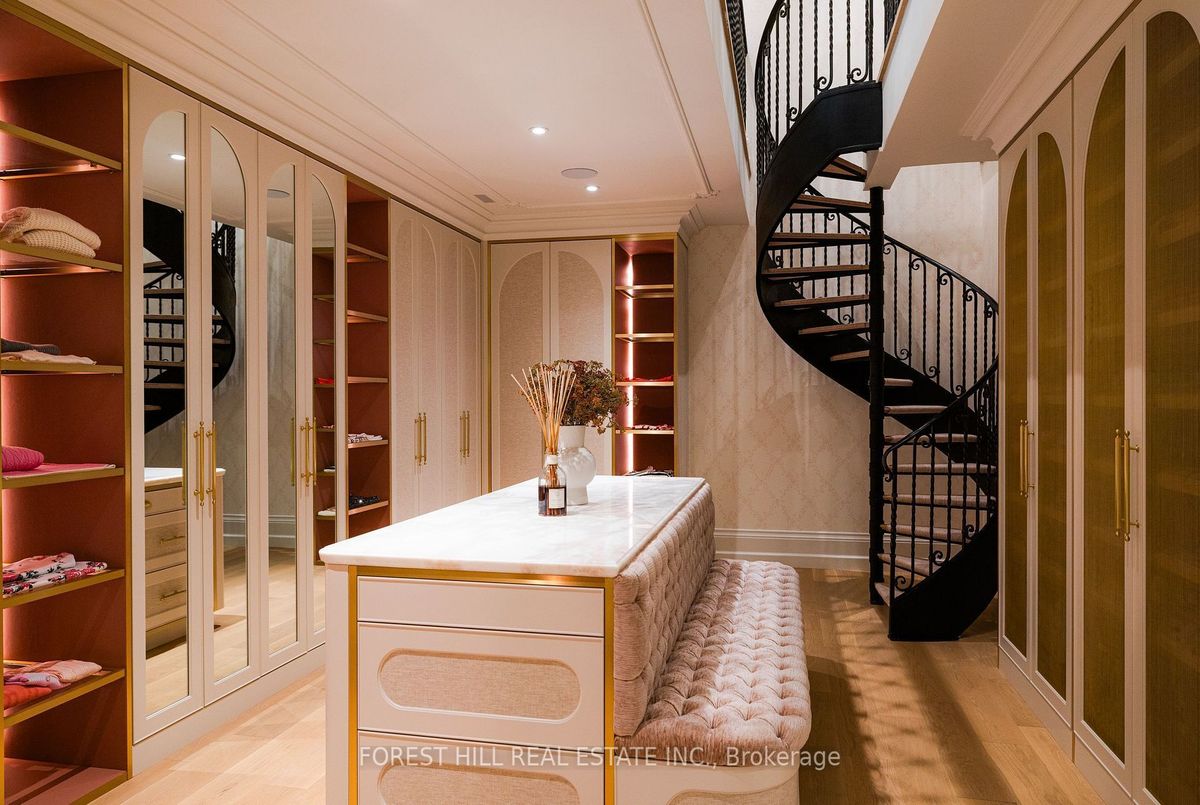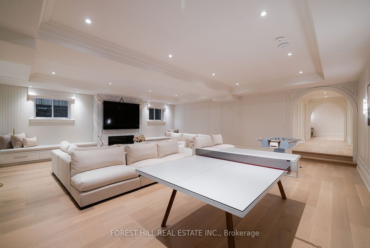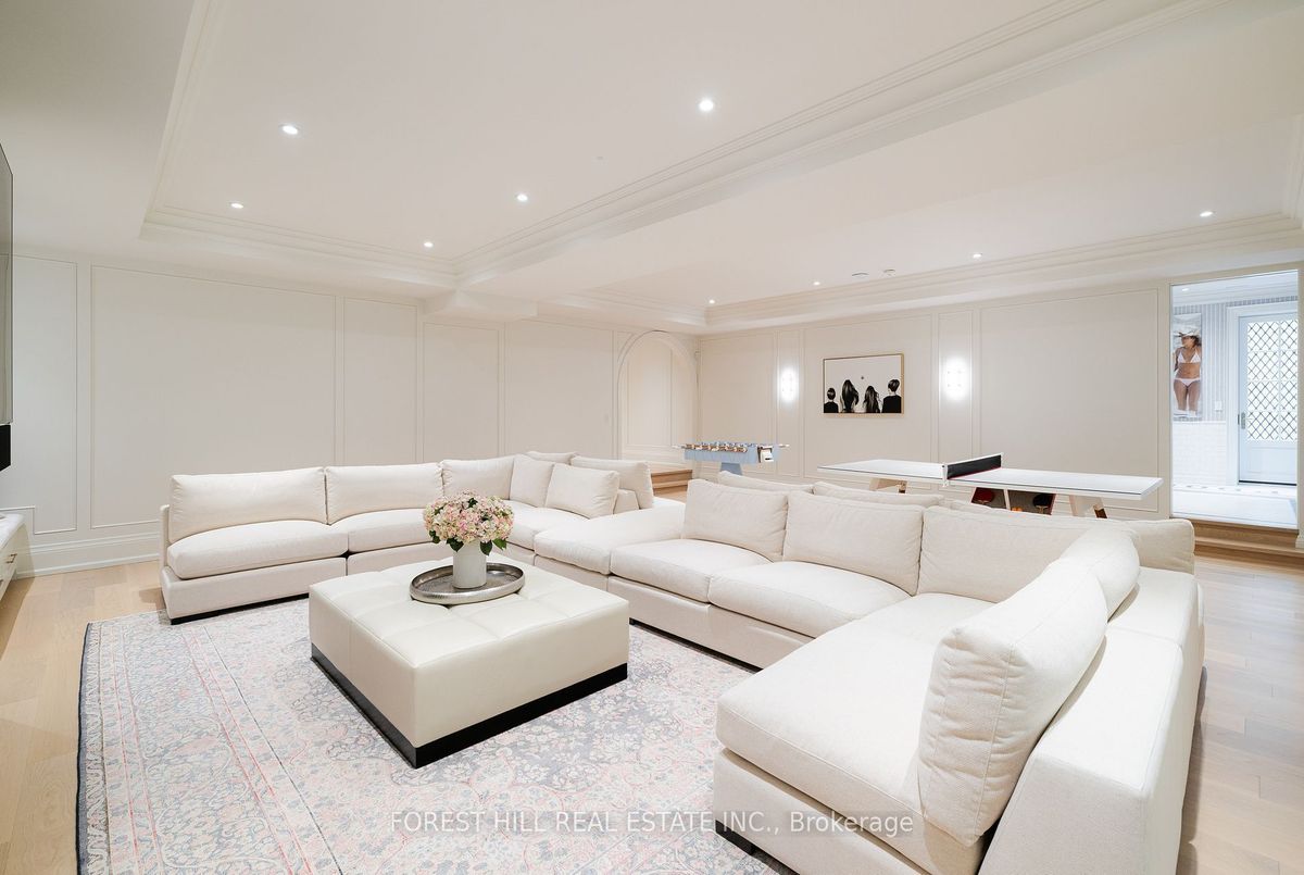 Welcome to 221 Forest Hill Road, an architectural triumph with nearly 13,000 sq ft of living space on a private 17,000 sq ft lot, nestled along the Beltline Trail in the heart of one of Toronto's most exclusive enclaves. This estate represents the pinnacle of bespoke luxury, meticulously brought to life by the city's finest: JTF Homes, Lorne Rose Architect, and Dvira Interiors. Clad in hand-selected limestone and inspired by the romance of the French countryside, the residence evokes the timeless elegance of a Provencal chateau. Arched windows with weathered-blue shutters, a stately turret, and a gracefully symmetrical facade create a striking first impression. A dramatic arcaded loggia opens onto manicured grounds and landscaping imagined by Fitzgerald and Roderick, featuring a lap pool, sports court, and lavish gardens that offer privacy and tranquility. The interiors are nothing short of breathtaking curated blend of old-world grandeur and modern refinement. The main level features soaring ceilings and a dramatic spiral staircase. Chevron-patterned white oak floors, arched passages, imported wallpaper, and tailored lighting reflect impeccable attention to detail. The formal dining room (seating 20) flows effortlessly into a statement kitchen adorned with hand-painted Portuguese tiles and custom cabinetry by Emanuele Furniture Design. The sunlit family room is anchored by a hand-carved fireplace and opens onto the gardens through elegant French doors. The crown jewel is the primary suite, a true sanctuary with vaulted ceilings, whimsical wallpaper, arched detailing, and a fireside lounge that creates a retreat-like atmosphere. The piece de resistance: a couture-inspired, two-storey dressing room with a spiral staircase and chandelier, paired with a spa-like ensuite clad in expansive stone and Shirley Wagner fixtures. The lower level features a sprawling rec room, games lounge, prep kitchen, gym, cedar sauna, and a home theatre for the ultimate cinematic escape.